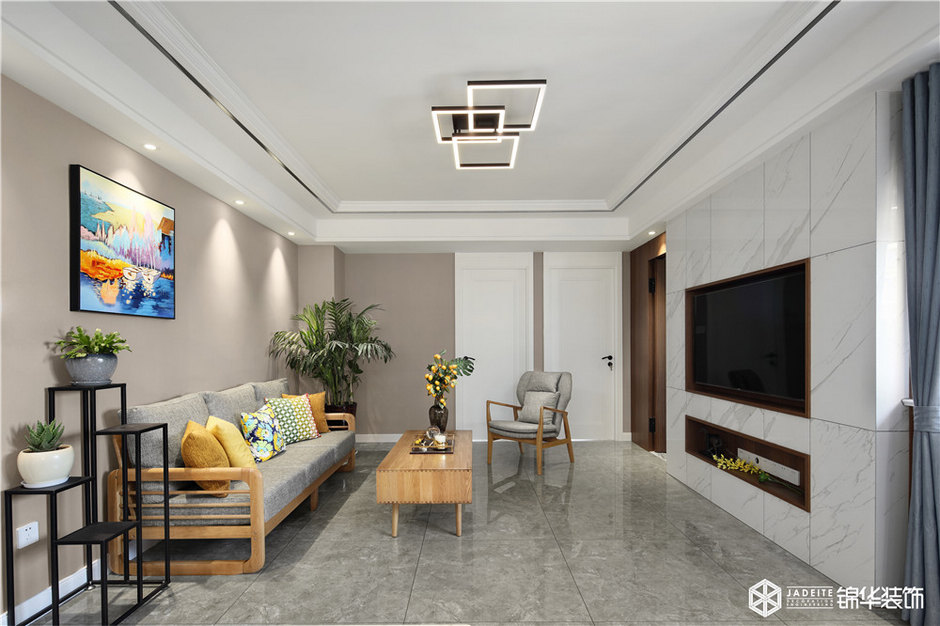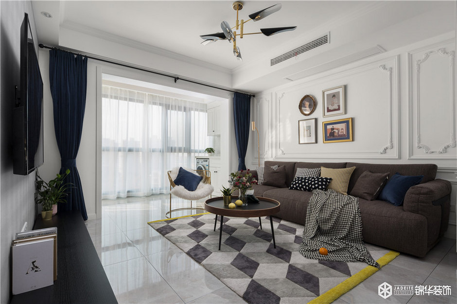 將陽臺空間納入室內,但因為原陽臺的梁無法拆除,如果將其全部遮蓋,客廳的整體高度會降低,設計師機智地做了一個美式經典的格子頂,美觀實用,然后加已線條做出層次使客廳空間看起來高挑。