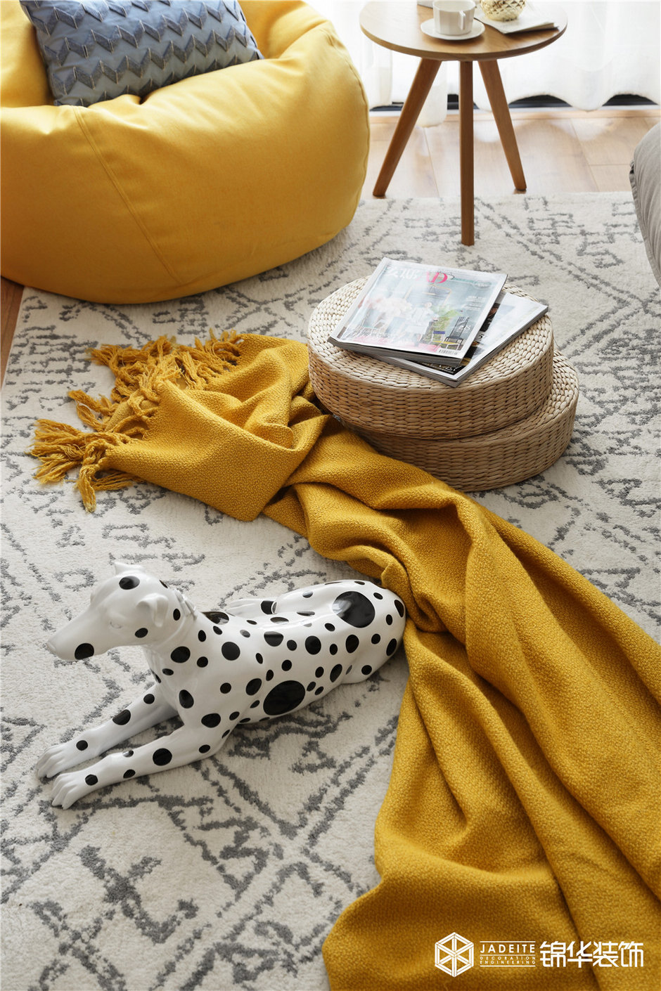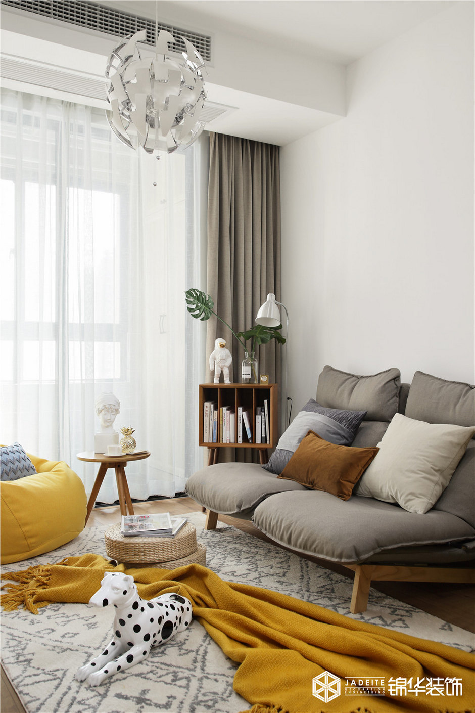 ▲色調以黃色、灰色、木色為主,溫暖又活潑。布藝、亞麻、木質等天然材料的運用,又為空間平添了一種慵懶的繾綣!